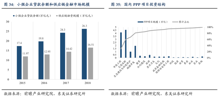 远东以金融创新为突破口,通过供应链金融拓宽服务业务渠道,通过普惠金融/PPP项目深化区域性政府合作,对公司影响力与业务发展提供新动力。2019年,远东宏信在涂料、化塑等领域开展供应链金融服务,为上游产业提供设备租赁,原材料代购等服务。远东与相关银行合作推出的“票据金融”“发票贷”等供应链金融创新产品,也帮助了部分小微企业解决融资难的问题。近年来国内工业企业应收账款余额持续增长,其中包括医疗,化工,机械制造等设备依赖型行业,随着供应链金融进一步发展,融资需求释放,行业市场空间巨大。作为融资租赁端龙头,公司将迎来更多的商业机会。政府合作方面,远东已与山西、山东、河北等多个省市政府展开PPP项目合作。截至2019年,公司累计PPP项目落地15个,回购期项目回款率100%。资料显示,国内PPP项目投资规模稳定增长,截止2020年3月,我国PPP项目投资金额达到14.39万亿元。其中与公司核心业务对口的市政交通类工程项目占总投资60%以上,为公司加强政府合作,扩大区域品牌影响力提供良好环境。