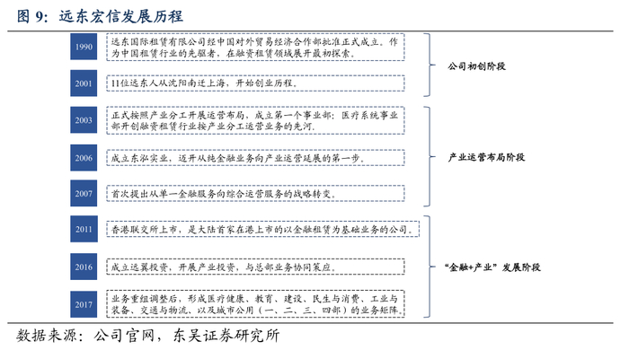 公司起步于融资租赁,形成“金融+产业”双轮驱动模式。远东宏信发展历程可以分为三大阶段,第一阶段为1990年-2000年,远东宏信作为我国租赁行业先驱,在融资租赁领域开始了最初探索;第二阶段为2000年-2010年,公司开始按照产业分类来开展融资租赁业务,先后设立医疗、包装、建设、交通、教育、工业装备事业部;第三阶段为2010-2020年,“金融+产业”成为公司新发展模式,远东宏信立足融资租赁,并设立医疗、教育、工程建设等9大产业。金融业务为产业业务提供资金与资源输入,产业业务方面的设备短板又为金融业务提供新客户需求,协同效应显著。