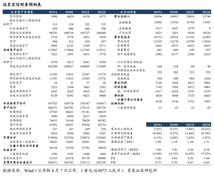 公司金融业务的生息资产增长稳健,预计2020~2022年公司营业收入分别为270亿元、297亿元、327亿元,同比增长分别0.5%、9.9%、10.4%;归母净利润分别45亿元、52亿元、60亿元,同比增长分别4.6%、13.6%、16.4%。预计2020~2022年每股收益分别为1.14元、1.30元、1.51元,每股净资产分别为7.96元、8.26元、8.58元,对应PE分别为4.84x、4.26x、3.66x,对应PB分别为0.70x、0.67x、0.65x。