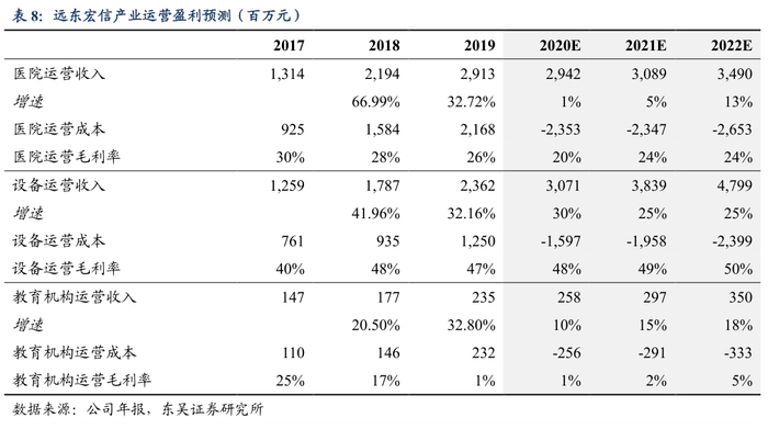 预计产业端主要分部保持业绩增速。公司的产业运营部分主要由医疗、建设设备、教育机构的运营构成。医院运营参股医院数及床位数量稳定增长方面,公司2020年加大了相关投入成本,毛利率预计下滑到20%,收入增速为1%,但未来运营方面,业务体系将更加完善成熟,走向利润释放期。预计2021~2022年医院运营收入增速分别为5%、13%,毛利率上升并维持在24%。设备运营方面,公司的设备资产规模较大,经营租赁业务已进入成熟阶段且盈利能力较强,预计2020~2022年设备运营收入增速分别为30%、25%、25%,毛利率为48%、49%、50%。教育机构的运营尚处于投入阶段,新项目的成本较高,导致毛利率较低,随着学校数量和学生人数的逐步扩大,教育运营收入有望不断增长,预计2020~2022年教育机构运营收入增速为10%、15%、18%,毛利率逐渐上涨,分别为1%、2%、5%。
