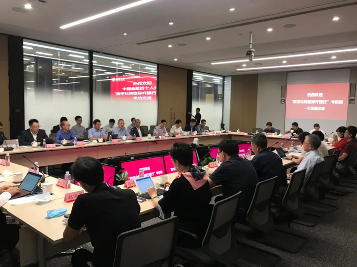 8月1日上午,考察团一行来到被誉为“零售之王”的招商银行。招商银行首席信息官江朝阳带领金融科技办公室、零售金融总部、公司金融总部、交易银行部、资产负债部、同业客户部等7个部门的负责人接待了考察团,从数字化发展战略、零售数字化转型、对公数字化转型以及数字化基础设施等方面详细介绍了招行数字化转型的现状,并与考察团成员展开了深度互动。