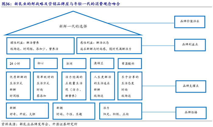采取“母品牌+区域品牌”策略,打造深度和广度。地方低温奶品牌历史较为悠久,消费者认知度和忠诚度较高,因此公司采取区域品牌叠加母品牌的联合品牌战略,保留被收购企业的品牌,用区域品牌打造深度。但同时,新乳业也会抽离一些可以做大的品类进行整合,如:用24小时整合中高端鲜奶品类、初心整合少添加、零添加的酸奶品类、活润整合功能性酸奶等,用全国品牌打造广度。未来随着品类成长,消费者对公司的品牌认知可以自区域公司品牌转化到统一产品认知再到品类认知最后到统一品牌认知,实现全国品牌整合发展。