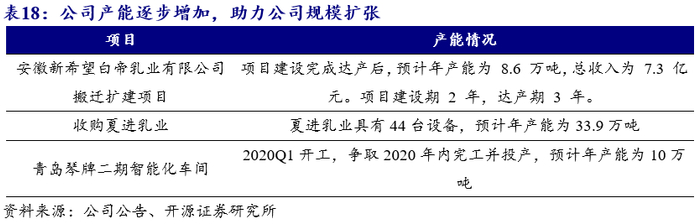 并购、自建并行进一步增加产能,助力公司全国化布局。新乳业投资5.7亿,于2015年年底完成了对四川乳业厂区的搬迁,建成西南地区最大的单体透明化低温乳品工厂,年产能近20万吨,其产品辐射整个四川及西南地区。2019年新乳业发行股票用于安徽新希望白帝乳业有限公司搬迁扩建项目,项目于2019年3月完成投产,预计年产能为8.6万吨,达产期为3年。2020年收购夏进乳业,预计将为公司带来34万吨产能。