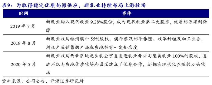 通过兼并收购及自建持续布局上游牧场。由于上游土地资源有限、建设规模化牧场成本较高,乳企建设牧场难度较大。公司一方面通过兼并收购在全国范围内布局牧场,如华西工厂在洪雅配套设有牧场;另一方面公司会根据战略需要在工厂周边配套建设牧场。自2019年上市以来,公司先后兼并收购了现代牧业、福州澳牛及夏进乳业。未来公司将持续采用并购战略获取优质奶源,扩大市场规模。新乳业未来将在甘肃永昌、宁夏海原和四川冕宁投资新建牧场,宁夏海原和甘肃永昌牧场预计可在2020年10月完工。