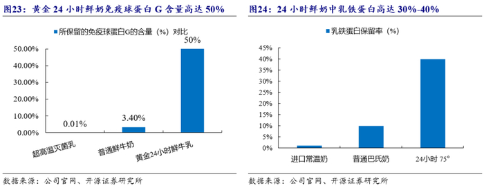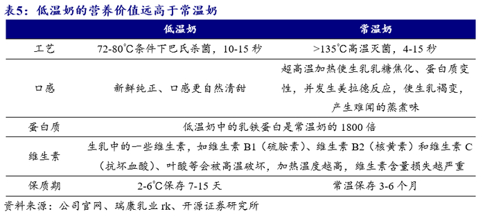 低温奶消费量仍可持续提升,低温市场具备较大发展潜力。随着人们对低温奶的认知提升、国家政策大力支持,我国低温乳制品消费量仍有较大提升空间:(1)低温奶营养价值丰富,采用72-85℃巴氏杀菌,可以保留更多的对人体有益的活性物质如乳铁蛋白、免疫球IgG等,且保质期可以短至5-7天,符合人们对食品更高的健康和新鲜度的需求。随着人们对低温奶营养价值的认知度提升、饮食西化,低温奶仍可持续量增。