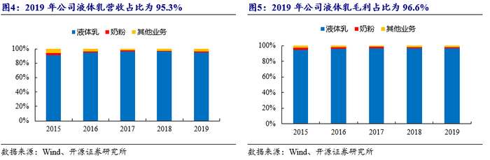 公司营业收入稳定增长,液体乳为主要收入来源。公司业务规模不断扩张,营收呈现稳定增长态势,2019年营收同比增长14.1%至56.8亿元。公司2015年转让了与主营业务相关性较小的华西国兴置业等 7家子公司,产生投资收益2.49亿元,使得2015年公司净利达3亿元。2019年公司净利增速低于营收增速主因:(1)原料奶价格上涨导致成本增加;(2)为了持续提升品牌影响力,2019年公司增加了品牌和营销方面的投入。液体乳为公司的收入和利润主要来源,2019年液体乳营收占比高达95.3%,毛利占比高达96.6%。