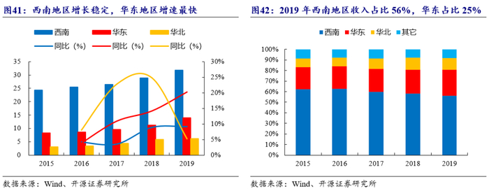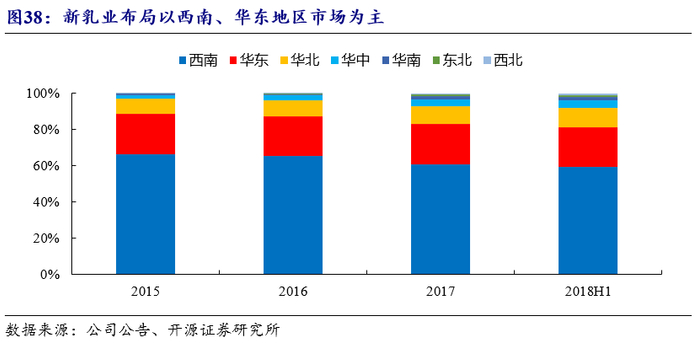 深耕西南,逐步布局全国。新乳业的第二轮并购主要布局在之前尚未布局或布局较少的空白市场。公司深耕西南地区,加速布局华东及华北地区,以西南逐步向全国扩张。公司目前:(1)西南地区主要包含四川乳业、昆明雪兰和云南蝶泉等知名地方性品牌,2019年西南地区实现营收31.9亿元,占总营收的56%;(2)华东地区主要拥有安徽白帝、杭州双峰和苏州双喜等知名本土品牌,2019年华东地区实现营收14亿元,同比增长20%,增长迅速。为了满足华东地区销售量高速增长的需求,公司于2019年开启安徽白帝新厂区建设项目,未来公司将重点布局华东地区;(3)华北地区主要收购了河北天香等品牌,2019年华北地区实现营收6.1亿元,占总营收的11%。此外,2020年5月,公司收购西北龙头乳企夏进乳业母公司寰美乳业,进一步拓展西北地区的业务。未来新乳业仍会通过兼并收购战略继续稳步推动全国化布局。