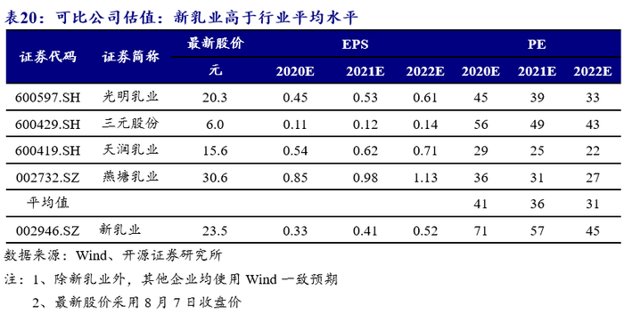 市场对于食品饮料行业通常采用相对估值方法。我们对比区域型和地方型主要乳制品企业的估值水平,可发现2020年行业平均估值在41倍PE左右,而新乳业估值71倍PE,高于行业平均水平。我们认为新乳业外延并购整合能力强,内生增长动力足,未来随着产能释放,业绩仍可持续增长,可享受估值溢价。