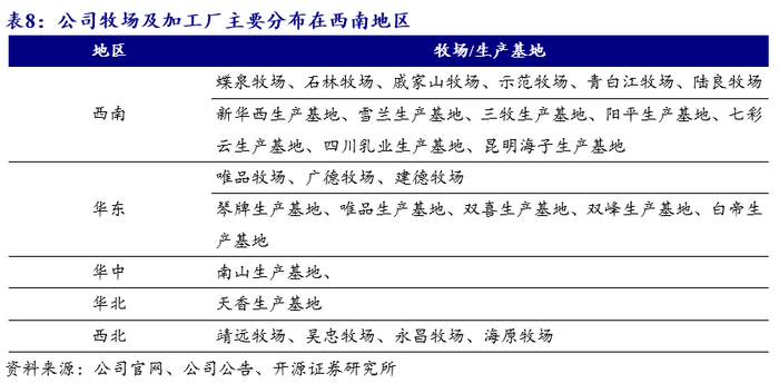 公司上游牧场资源丰富,保障优质原奶供应。新乳业现有13个牧场,主要分布在西南和华东地区。公司牧场资源优质,其中7家取得良好农业规范认证,8家取得学生饮用奶的奶源基地认证,2家取得有机牧场认证,6家取得优质乳工程示范牧场认证。