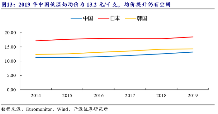我国低温奶均价与常温奶相近,但较日本等国家低。近年来常温奶从品类、包装、口味、蛋白质含量等方向上持续进行升级,均价逐渐提升,低温奶与常温奶间均价差距已不明显。根据Euromonitor数据,2019年中国常温奶、低温奶均价分别为12.8元/千克和13.2元/千克,二者价格相近。但与饮食习惯相近的发达国家如日本相比,我国低温奶均价仍较低,2019年日本的低温奶均价为18.5元/千克,为中国的1.45倍,中国低温奶均价提升仍有空间。