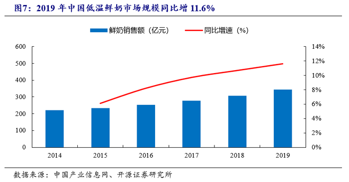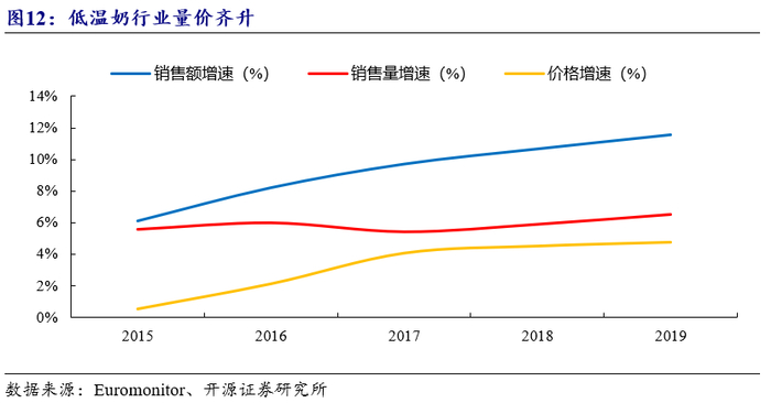 低温奶行业量价齐升,量增为主要增长动力。我国低温奶行业正处于量价齐升阶段,其中量增为行业增长的主要动力。根据Euromonitor数据,2019年我国低温奶行业整体增11.6%至343.2亿元,其中量增6.5%至260万吨、均价增4.8%至13.2元/千克。