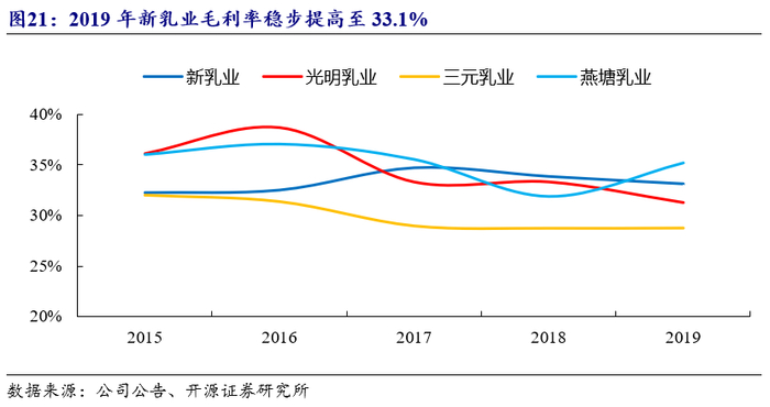 持续推行“鲜战略”,低温乳制品占比快速提升,拉升公司毛利率。新乳业于2002年开始进入乳制品行业,2010年提出“鲜战略”后重点发展低温乳制品,目前经营产品包括低温鲜奶、低温酸奶、低温调制乳、低温乳饮料、常温纯牛奶、常温乳饮料、常温调制乳、常温酸奶及奶粉等9大类。近年来公司低温乳制品发展较快:(1)低温乳制品占比持续提升,2014年占比约40%,2019年占比超60%,其中低温鲜奶占比由12.5%提升至约20%,低温酸奶占比由22.8%提升至约38%。(2)2019年低温鲜奶和低温酸奶均实现双位数增长,远高于常温奶及其他个位数的增速。公司低温乳制品定位中高端,毛利率较高,拉升公司整体毛利率至33.1%,未来公司将持续推行“鲜战略”,专注发展低温奶领域。