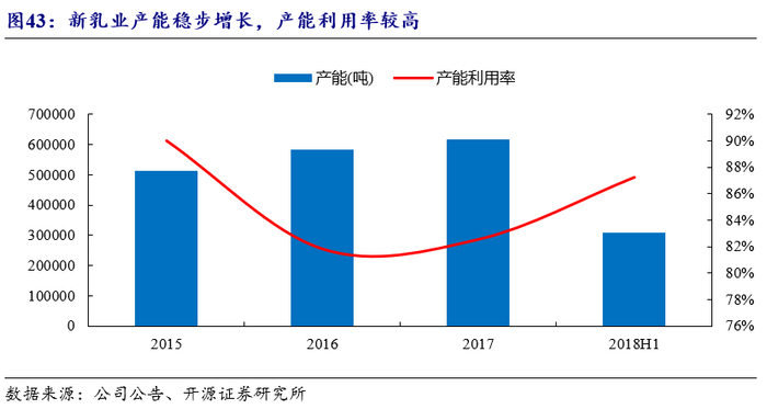 产能稳步增长,产销率较高。新乳业产能稳步增长,自2015年的51万吨增至2017年的61.8万吨。其中低温乳制品产能增长迅速,2016、2017年增速分别为27.21%和14.48%。低温乳制品产能占比自2015年的38%提升至2018H1的45%。公司产销率较高,2015年至2018H1公司常温奶产销率保持在99%以上,低温奶产销率保持在97%以上。