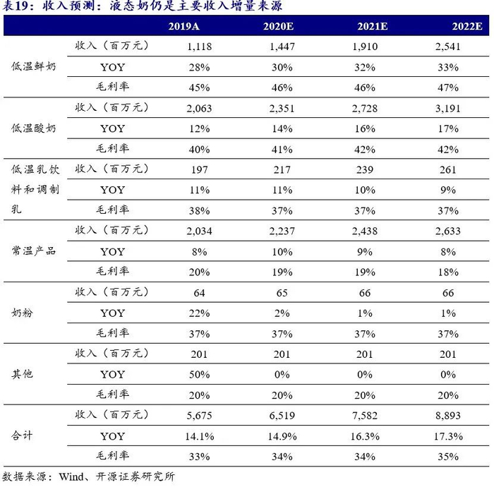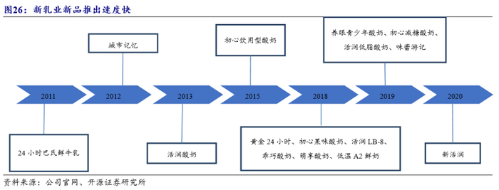 出新速度较快,满足消费者差异化需求。公司新品推出速度快,产品创新度高,如:(1)2019年底公司推出初心减糖酸奶、活润低脂酸奶、味蕾游记等新品,在市场上取得了良好的反响;(2)2020年公司推出升级版活润晶球酸奶,采用3D包埋技术,将益生菌立体包埋在晶体球之中,使得益生菌能直达肠道而不被胃酸破坏,推动我国功能酸奶迈向新时代。公司不断开发新品以满足消费者个性化、多样化、健康化的消费需求。