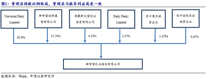新乳业管理层与股东利益高度一致。刘永好和刘畅父女为公司的共同实际控制人,刘畅女士通过Universal Dairy Limited持有公司65.6%的股份,刘永好先生通过新希望投资集团有限公司持有公司15.7%的股份。西藏新之望创业投资有限公司、苏州惠风投资企业及杭州金色衣谷投资管理合伙企业主要由新乳业高管及被收购企业的高管持股,因此公司管理层持股比例较高,管理层与股东利益高度一致。