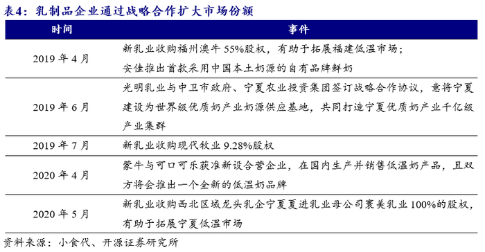 低温奶乳制品企业通过战略合作、兼并收购实现扩张,可快速扩大市场份额。受奶源、冷链及渠道影响,低温奶具有较强的区域性,仅靠内部资源扩张具有一定难度,因乳制品企业通过战略合作、兼并收购实现上下游资源整合,实现扩张。如新乳业于2019年收购了福州澳牛55%股权及现代牧业9.3%股权,于2020年收购宁夏夏进乳业母公司寰美乳业100%的股权;光明乳业于2019年与中卫市政府、宁夏农业投资集团签订战略合作协议,意将宁夏建设为世界级优质奶产业奶源供应基地;蒙牛乳业借助京东等渠道销售产品;恒天然与家乐福、盒马生鲜合作进而推出自有品牌低温奶。通过战略合作、兼并收购,乳企可扩大市场份额,未来行业集中度将进一步提升。