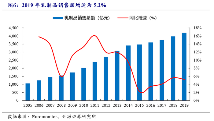 乳制品行业规模稳步增长。2005年以来,中国乳制品行业规模快速增长,2006年行业增速高达15.9%。2008年受三聚氰胺事件影响,乳制品行业增速自2007年的13.9%下滑至2008年的5.9%。随后,行业逐渐复苏,2009年-2014年行业CAGR达14.4%。乳制品行业一直稳步增长主因:(1)国家出台相应政策,规范和鼓励乳制品行业的发展,如《全国奶业发展规划(2016-2020年)》、《关于推进奶业振兴保障乳品质量安全的意见》等;(2)消费者的健康意识提升,对乳制品的营养价值认知度增加;(3)乳制品企业渠道下沉,可提供更多产品至不同层级的城市。随着乳制品市场逐渐成熟,行业增速放缓,2019年乳制品行业增长5.2%至4196亿元。