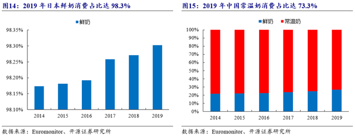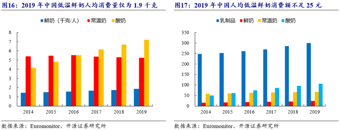 目前我国低温鲜奶消费量仍较低。我国低温鲜奶的消费量仍有很大提升空间:(1)从消费结构来看,目前我国消费结构中低温鲜奶占比显著低于发达国家。根据Euromonitor数据,2019年中国常温奶消费占比达73.3%,低温鲜奶消费占比约26.7%;而饮食习惯相近的日本2019年低温鲜奶消费占比高达98.3%。(2)从人均消费量来看,目前我国人均鲜奶消费量仍较低。根据Euromonitor数据,2019年中国人均鲜奶消费量为1.9千克/人,而日本、韩国、澳大利亚等人均鲜奶消费量分别为16.4千克/人、13.5千克/人、61.7千克/人。