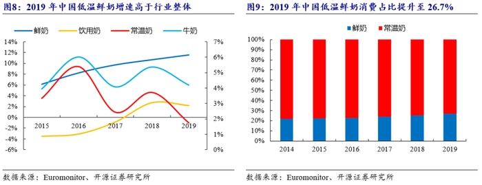 低温鲜奶和低温酸奶行业快速崛起。根据Euromonitor分类,乳制品包括饮用奶、酸奶、奶酪、黄油等子行业。饮用奶子行业中包括调味乳、牛奶等,其中牛奶包括常温奶和低温鲜奶。低温乳制品受到越来越多消费者喜爱,市场规模快速增长。根据中国产业信息网数据,低温鲜奶市场规模由2015年的234亿元增长至2019年的343亿元,2015-2019年CAGR达8%。低温酸奶及低温鲜奶市场规模增速均高于行业整体增速。根据Euromonitor,低温鲜奶占牛奶销售额比例也快速提升,自2014年的21.6%提升至2019年的26.7%。