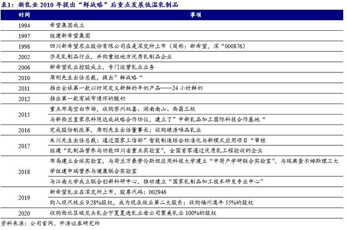 公司重点发展低温乳制品,构建城市型乳企联合舰队。新希望乳业控股于2006年成立,于2019年上市,主营业务为乳制品及含乳饮料的研发、生产和销售。公司于2002年正式涉足乳制品行业,通过并购重组地方优质乳企实现扩张。经过近10年的探索与总结,公司形成了独特的“1+N”的发展模式及较强的投后管理能力。同时,2010年公司确定“鲜战略”作为公司核心战略,重点布局、着重发展低温乳制品,构建城市型乳企联合舰队,公司业务规模逐步扩大。