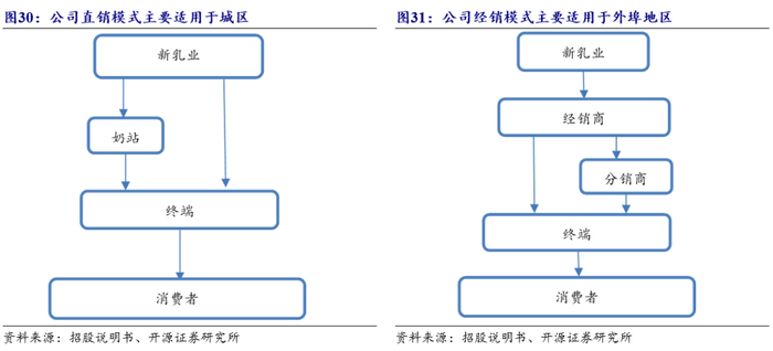 (1)直销模式:公司直接与大型超市、连锁、教育局等渠道合作,客户包括家乐福、永辉超市、联华超市、红旗连锁等。此外,直销模式下也有极少部分送奶到户销售。直销模式的毛利率高于经销模式毛利率,主因:经销模式下公司给予经销商一定的利润空间方便经销商根据实际销售情况进行资源配置;直销模式中毛利率较高的低温产品占比较大。