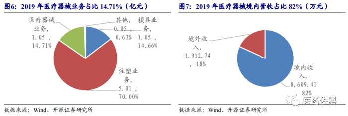 公司的产品主要分为3个板块,分别为注塑业务,医疗器械业务和模具业务。2019年,公司实现营业总收入为7.15亿元,较2018年同期增加3.13%,其中注塑业务占比70.00%,医疗器械营收1.05亿元,占比14.71%。模具和注塑业务毛利率低,医疗板块还在孵化培育阶段,未显示出较强的盈利能力,故2019年归属于上市股东的净利润仅6,179.21万元,同比增长8.70%。医疗器械业务加速扩张趋势明显,我们认为将会是公司未来的第一大规模业务。