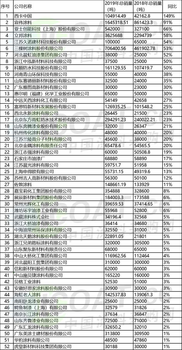 2019年涂料百强企业销量增长前三名西卡、宣伟、亚士创能