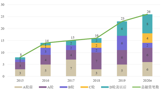 图4:2015—2020e中台服务商融资情况(2020年上半年融资13笔,推测全年26 笔)