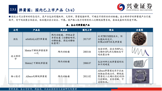 1)国内弹簧圈、导丝导管技术相对成熟,多家公司已有产品上市,如沛嘉医疗的Jasper与Presgo弹簧圈、泰杰伟业最新的水凝胶可膨弹簧圈等,性价比是国产替代的关键,支架辅助弹簧圈,球囊导引导管系统等组合模式是新兴发展方向,在宽颈动脉瘤等适应症上具有较明显优势;