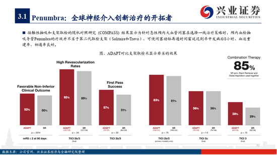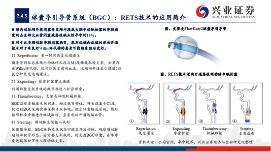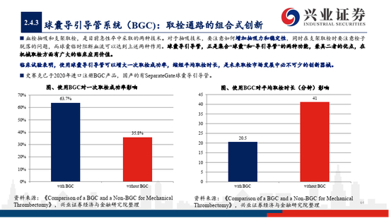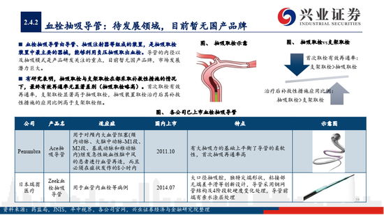 2)使用抽吸导管的ADAPT技术取栓,目前暂无国产品牌。抽吸取栓能够明显缩短取栓时间,提高完全再通率,市场发展潜力大,如何平衡抽吸力与远端血管到达率、提高首次再通率是研发关注重点;