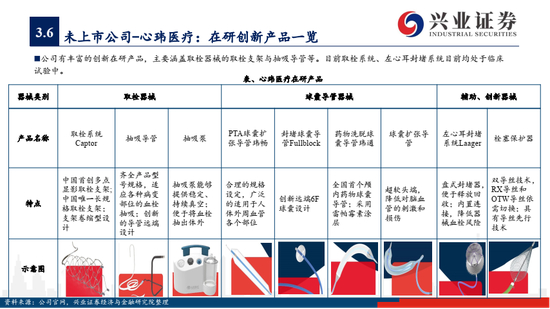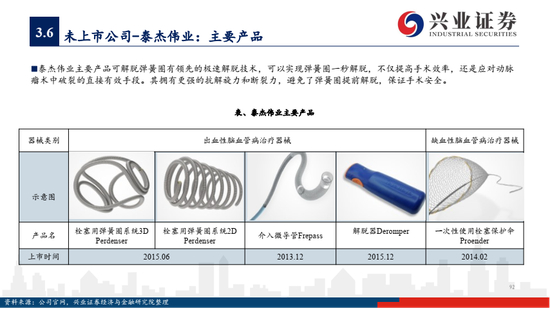 国内神经介入领域未上市企业有维心医疗 (Albuca弹簧圈)、泰杰伟业(Perdenser和Perfiller弹簧圈)、心玮医疗 (Captor取栓支架在研) 等,作为新锐企业有丰富的在研产品梯队,在弹簧圈、取栓支架等核心器械上位居国产前列。