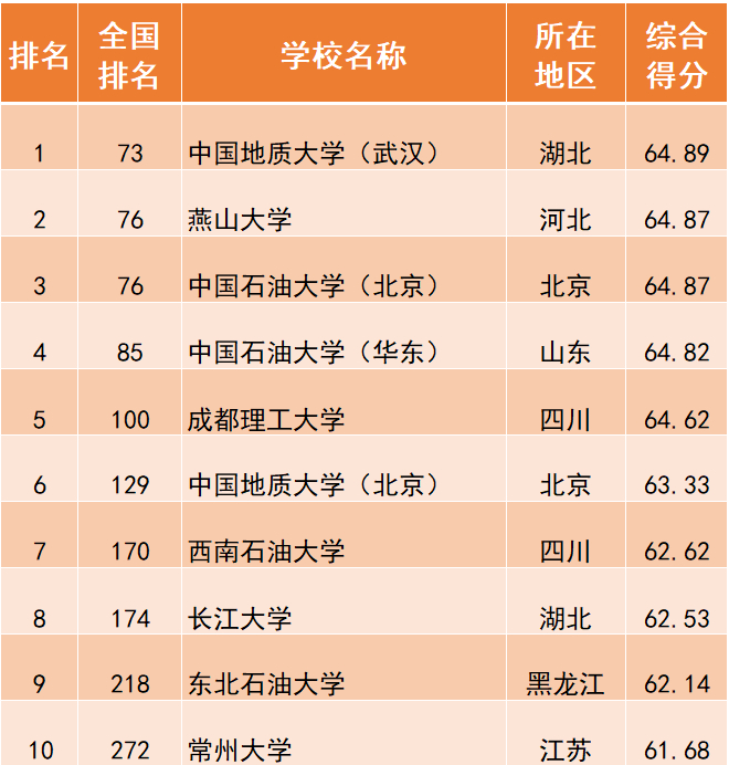 中国地质大学(武汉)、中国石油大学(华东)、燕山大学位列前三强。