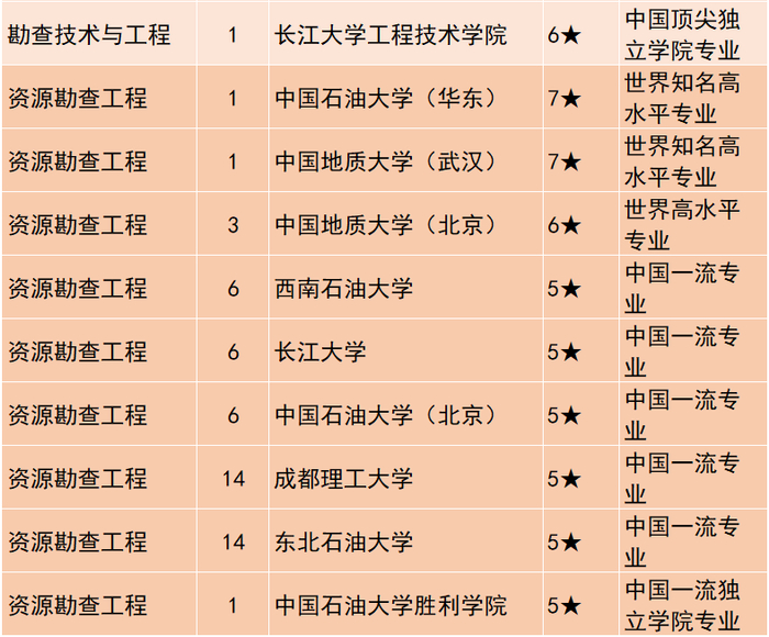 石油类高校中,中国地质大学(武汉)位居地质工程专业排名首位;长江大学工程技术学院位居勘查技术与工程专业排名首位;而中国石油大学(华东)与中国地质大学(武汉)、中国石油大学胜利学院并列,摘得了资源勘查工程专业的桂冠。