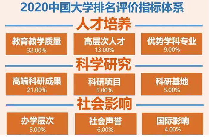 2020中国大学排名评价综合了教育教学质量、高层次人才、优势学科专业、高端科研成果、科研项目、科研基地、办学层次、社会声誉和国际影响等9大核心指标组成。