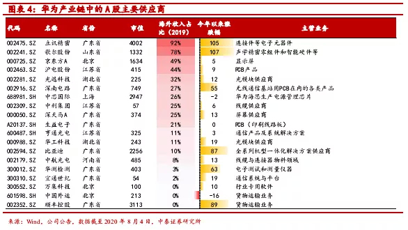 本篇报告我们结合华为供应商大会公布的核心供应商名录以及上市公司2019年年报公布的前五大客户名单筛选出中国(包括中国台湾、中国香港)的华为供应商体系,总共40家。