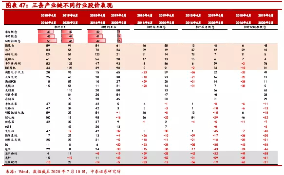 (2)如何把握产业链中的好赛道?从产业链不同环节历史的股价表现来看,2015年以来三条产业链同时具有明显相对收益期间,股价排名靠前的行业主要集中在摄像头、芯片、动力电池、半导体封测等领域。相反,光纤、电脑硬件、显示面板表现相对低迷。