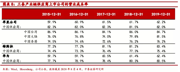 从产品结构看,中国供应商主要集中在技术含量较低的结构件领域。2019年公布的苹果200家核心供应商名单中,中国公司(包括中国台湾与中国香港)合计上榜86家。其中,台湾的供应商最多有46家,而中国大陆与香港分别上榜30家与10家。从行业分类看,中国整体的上市供应商排名前三的主要分布在技术硬件与设备(43家)、半导体(6家)、资本货物(6家)。
