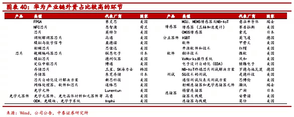 华为海外供应商:目前芯片、传感器、软件、功率半导体等领域海外供应商参与的程度较高。尤其是芯片领域的存储芯片、FPGA以及软件领域的EDA软件领域中国供应商的参与程度较低,海外垄断的趋势明显。