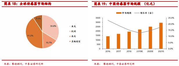 传感器:全球传感器市场约1500亿美元。根据赛迪统计,2019年全球传感器市场规模1521亿美元,增长率达到9.2%。其中,北美市场规模占全球比重41.2%左右,亚太区是仅次于北美市场的世界第二大传感器市场,占比达到34.8%。中国传感器市场规模2188.8亿元。往前看,预计到2021年市场规模有望达到2951.8亿元。
