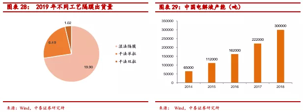 隔膜:中国隔膜出货量月27亿平米。锂电隔膜作为锂电池的重要组成部分,在锂电材料总成本占比为5~10%。根据GGII的统计,2019年中国锂电隔膜出货量为27.4亿平米,同比增长35.6%,锂电隔膜市场规模(只统计基膜)35.6亿元,同比下滑12.2%。其中,2019年湿法隔膜出货量19.9亿平米,同比增长51.2%,占比隔膜总出货量72.6%,增加7.5个百分点。往前看,2018年隔膜国产化率已经达到了93%。随着锂离子电池隔膜行业竞争激烈,不具备自主研发设计能力的锂离子电池隔膜厂商的发展空间将逐渐缩小。