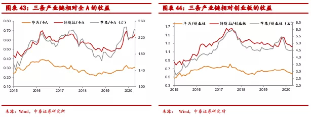 根据苹果、华为、特斯拉相关概念标的的价走势,我们发现三者的投资路径出现较强的共性。具体来说,与全A相比:2015年中至2016年中,2019年下半年至2020年1季度三条产业链均出现较明显的相对收益;而与创业板相比这种相对收益集中体现在2015年终至2017年年底。
