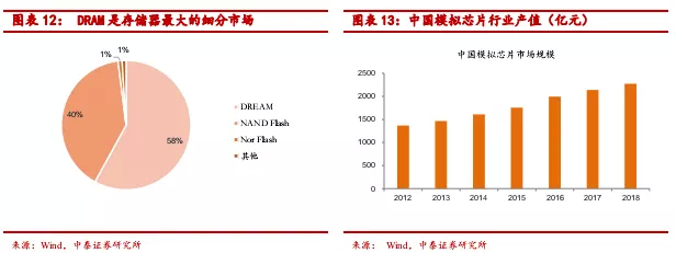 存储芯片:全球存储芯片的市场规模约1200亿美元。根据WSTS的统计,2019年全球存储芯片市场规模1155亿美元,销售额同比减少31.5%。内存的具体细分类别中,DRAM产品的销售额下降了37.1%,NAND闪存产品的销售额下降了25.9%。除此之外的所有其他产品的销售额合计下降了1.7%。往前看,根据Gartner最新的预测, 2020年全球存储市场规模将达到1247亿美元,其中,NAND闪存收入预计将在2020年增长40%,DRAM市场整体收入将在2020年下降2.4%。
