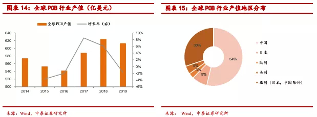 PCB:全球PCB行业产值约610亿美元。根据Prismark统计,2019年全球PCB行业产值613亿美元。其中,中国PCB产业产值占全球产值的比重约为53.7%,产值约为329亿美元,是2019年唯一成长的地区,这主要得益于5G建设的高度成长。往前看,2019-2024年,中国PCB产值的年均复合增长率预计为4.9%,是唯一超过全球平均年复合增长率的区域,仍然是全球PCB产业表现最好的区域。