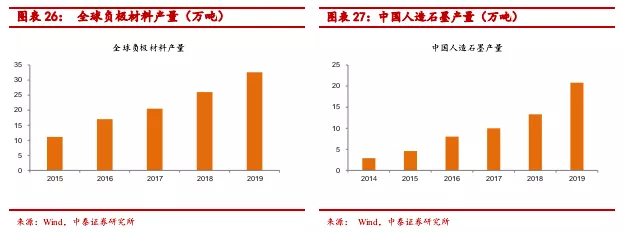 负极材料:全球负极材料出货约33万吨。目前应用最广的负极材料仍然是天然石墨和人造石墨两大类。根据GGII的统计,从全球负极材料产量来看,2019年全球负极材料产量为32.6万吨,同比增长25.4%。中国负极材料产量为26.5万吨,同比增长38%,占全球负极材料产量81%。其中人造石墨出货量20.8万吨,占比负极材料总出货量78.5%,相比2018年占比提升9.2个百分点。