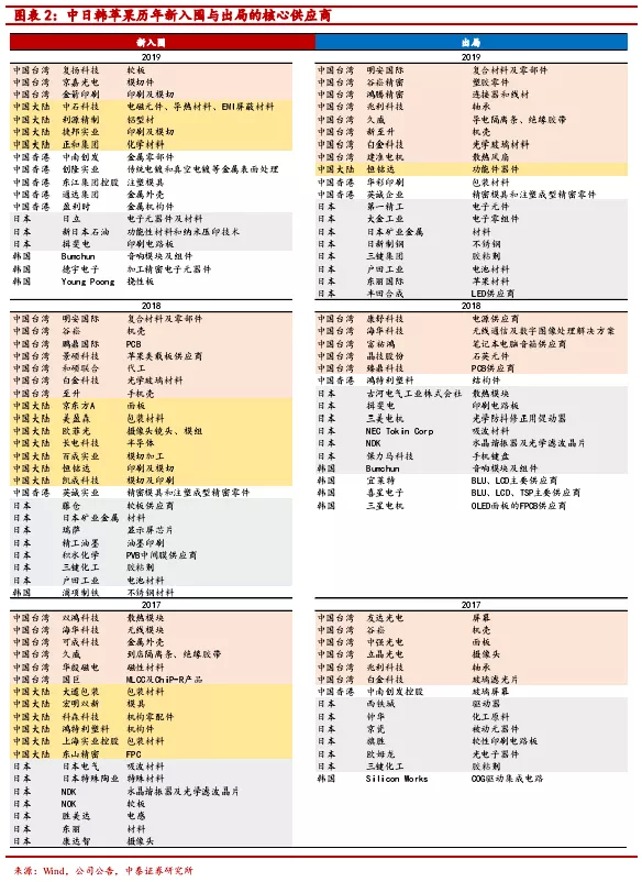(1)动态变化看:从近年来苹果核心供应商的频繁洗牌中,我们发现价值低端的零部件制造公司被替代的风险显著高于芯片领域。通过筛选2014~2019年中国(包括中国香港与中国台湾)入围与出局的公司分类,数据显示,包装印刷、PCB、精密结构件等领域的厂商频繁发生变动;