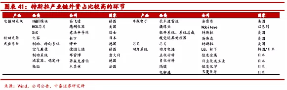 特斯拉海外供应商:目前电驱动系统、芯片、部分电力电子器件等领域海外供应商参与的程度较高。尤其是车载电子领域的摄像头、毫米波雷达以及电驱动系统领域的IGBT模块国内供应商产品力较弱难以进入,海外垄断的趋势明显。