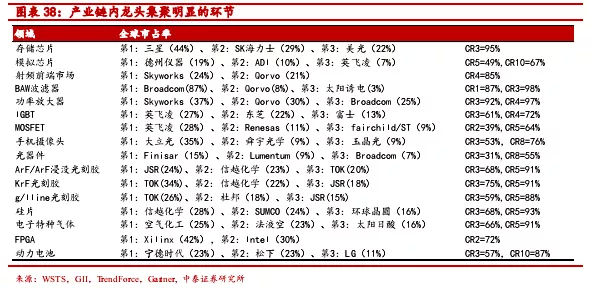 目前三条产业链内许多领域都呈现了资源向龙头集聚的特征。其中,存储芯片、BAW波滤器、功率放大器、IGBT、ArF/ArF浸没光刻胶、KrF光刻胶、电子特种气体、FPGA的CR3的全球市占率甚至超过了60%。尤其是DRAM市场近年来龙头集聚的趋势最为明显。