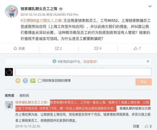 据中国科技新闻网报道,2019年12月,一位账号名为链家哺乳期女员工之殇的用户在微博发帖称,她是链家6年老员工,工作地一直在上海,6年签了5份合同却都是签外地合同,她由此质疑,上海链家以此逃避为员工缴纳上海社保,并拖欠佣金。