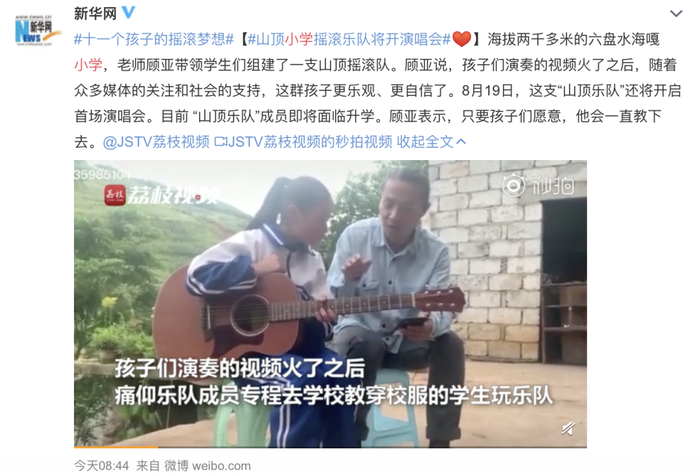 两个月前,一则山区小学摇滚乐队翻唱痛仰乐队歌曲的视频在微博流传。场地中间,一个举着麦克风的小姑娘姿态潇洒地蹦着跳着。