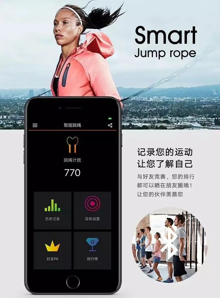 一个人跳绳总是很无聊的,而这款智能跳绳最好玩的地方,就是能够连接APP记录你的运动,让你更加了解自己。